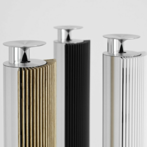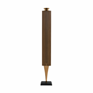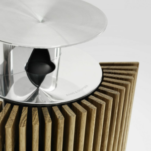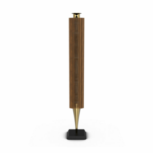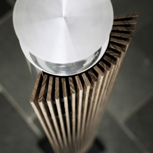 The aluminium pillar balances almost magically on its pointed base, while the crafted wooden lamellas appear to be fanning out the sound across your room in concert with the acoustic lens on top. Meet design and engineering in perfect harmony.