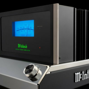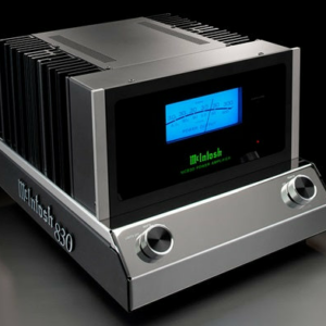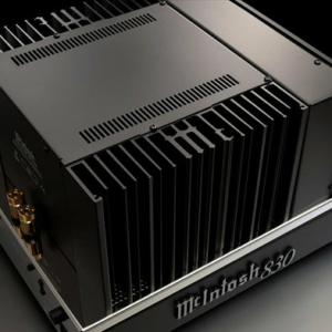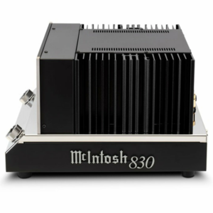 A die-cast aluminum name badge is affixed to each side of the chassis, and the front, top, and rear of the chassis is polished to a mirror finish. The MC830 features a black glass front panel with silver trim, a blue Watt meter, an illuminated logo, and control knobs.