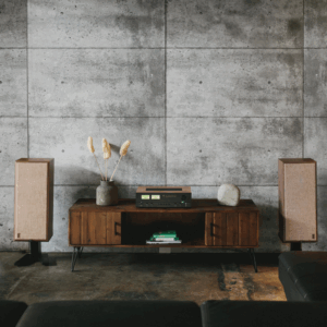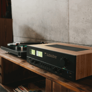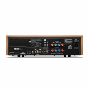 • Retro design elements include satin walnut case, front-panel VU meters, push-button input controls, 1970s cursive branding, and dark grey front panel