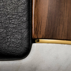 Dedicated black anodized aluminum columns, filled with damping material and mounted on a Carrara marble base, provide loudspeaker support. Aluminum and marble are separated by a thin brass sheet, consistent with the speaker cabinet.